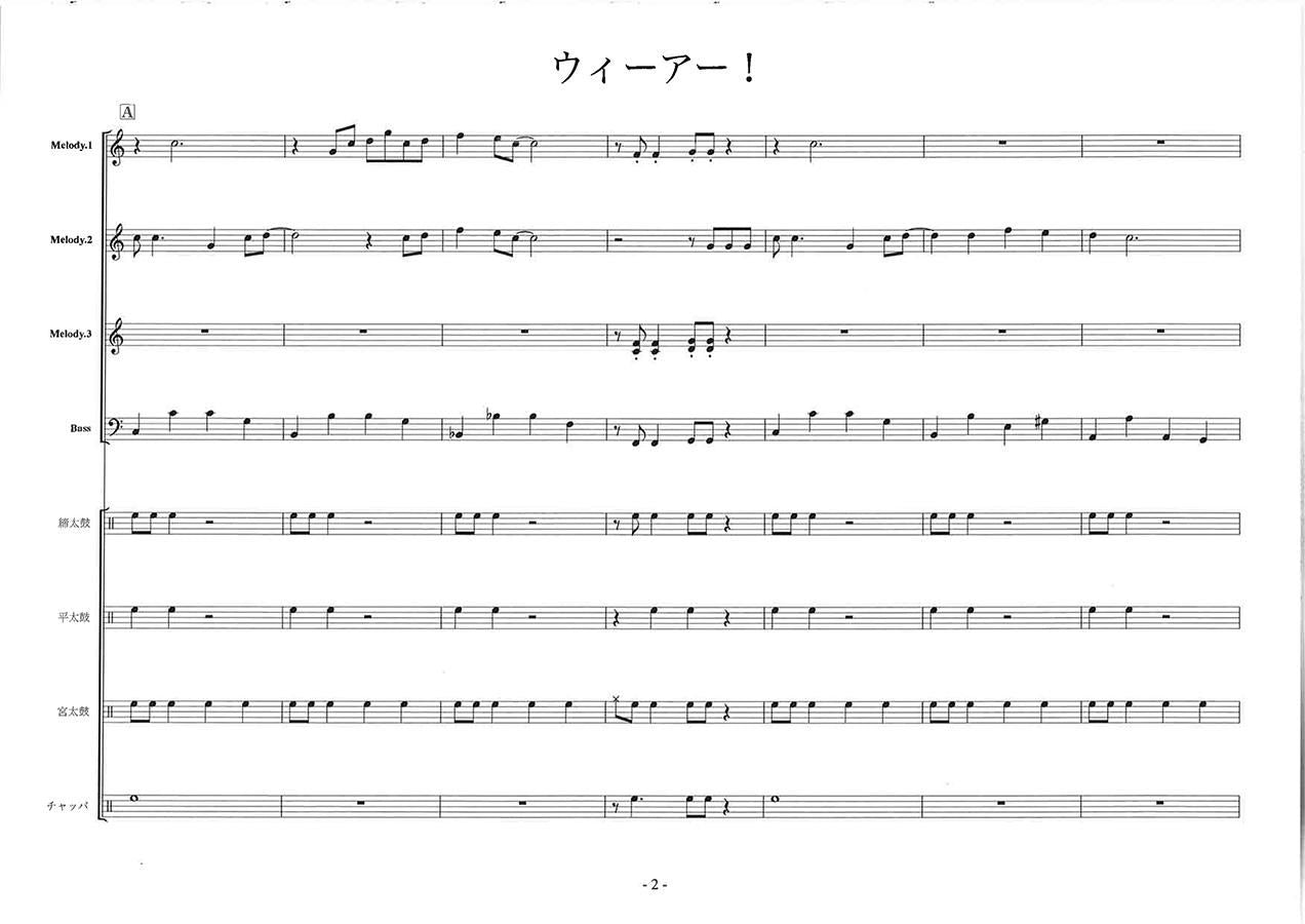 主な使用楽器:鍵盤ハーモニカ、グロッケン(鉄琴)、ビブラフォーン(鉄琴)、マリンバ(木琴)、シンセサイザー(電子オルガン)、ベース(低音楽器)、宮太鼓、長胴太鼓、平太鼓(たる太鼓)、締太鼓、チャンチキ、チャッパ等