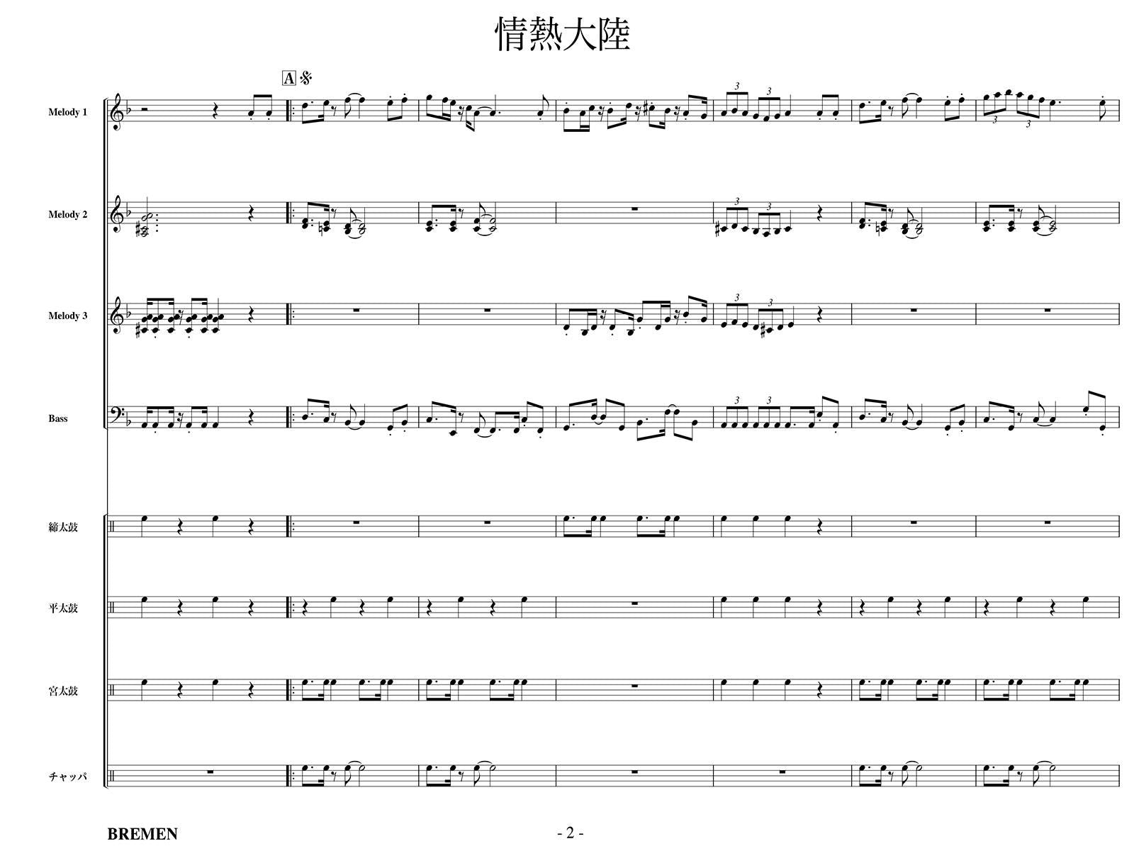 主な使用楽器:鍵盤ハーモニカ、グロッケン(鉄琴)、ビブラフォーン(鉄琴)、マリンバ(木琴)、シンセサイザー(電子オルガン)、ベース(低音楽器)、宮太鼓、長胴太鼓、平太鼓(たる太鼓)、締太鼓、チャンチキ、チャッパ等