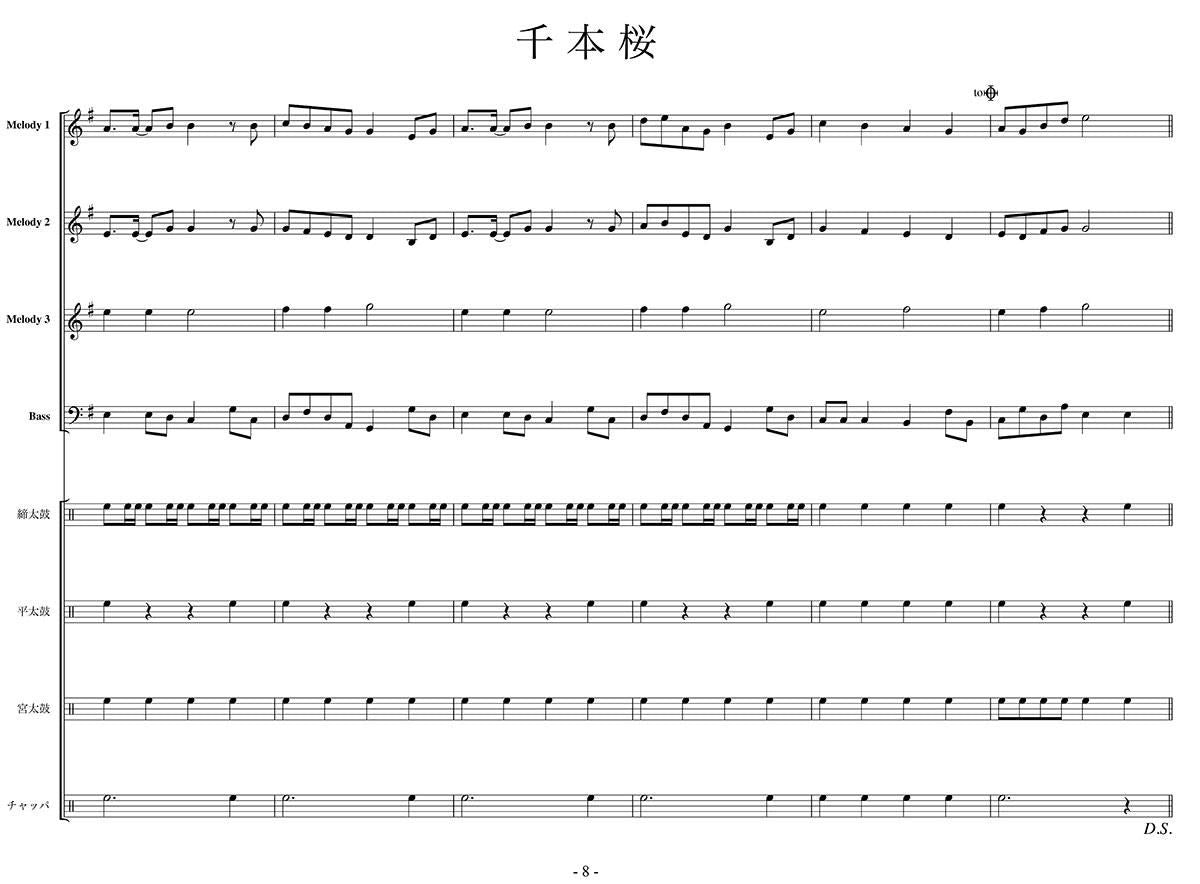 主な使用楽器:鍵盤ハーモニカ、グロッケン(鉄琴)、ビブラフォーン(鉄琴)、マリンバ(木琴)、シンセサイザー(電子オルガン)、ベース(低音楽器)、宮太鼓、長胴太鼓、平太鼓(たる太鼓)、締太鼓、チャンチキ、チャッパ等