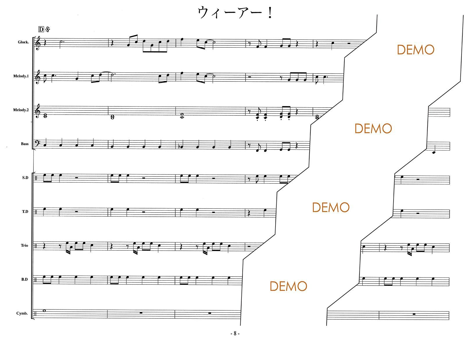 主な使用楽器:グロッケン(鉄琴)、マーチングキーボード、ベース(低音楽器)、スネアドラム(小太鼓)、テナードラム(中太鼓)、トリオタム(ツインタム)、バスドラム(大太鼓)、シンバル等