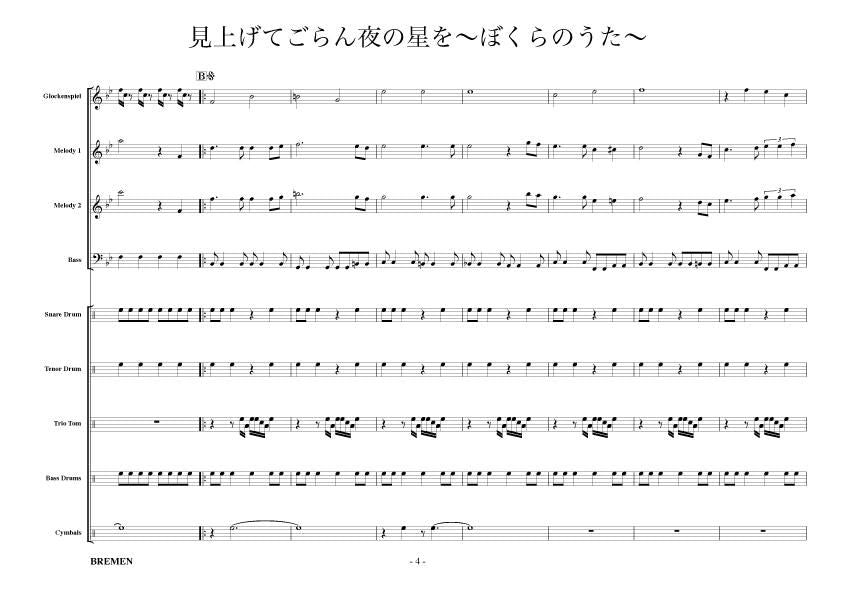 主な使用楽器:グロッケン(鉄琴)、マーチングキーボード、ベース(低音楽器)、スネアドラム(小太鼓)、テナードラム(中太鼓)、トリオタム(ツインタム)、バスドラム(大太鼓)、シンバル等