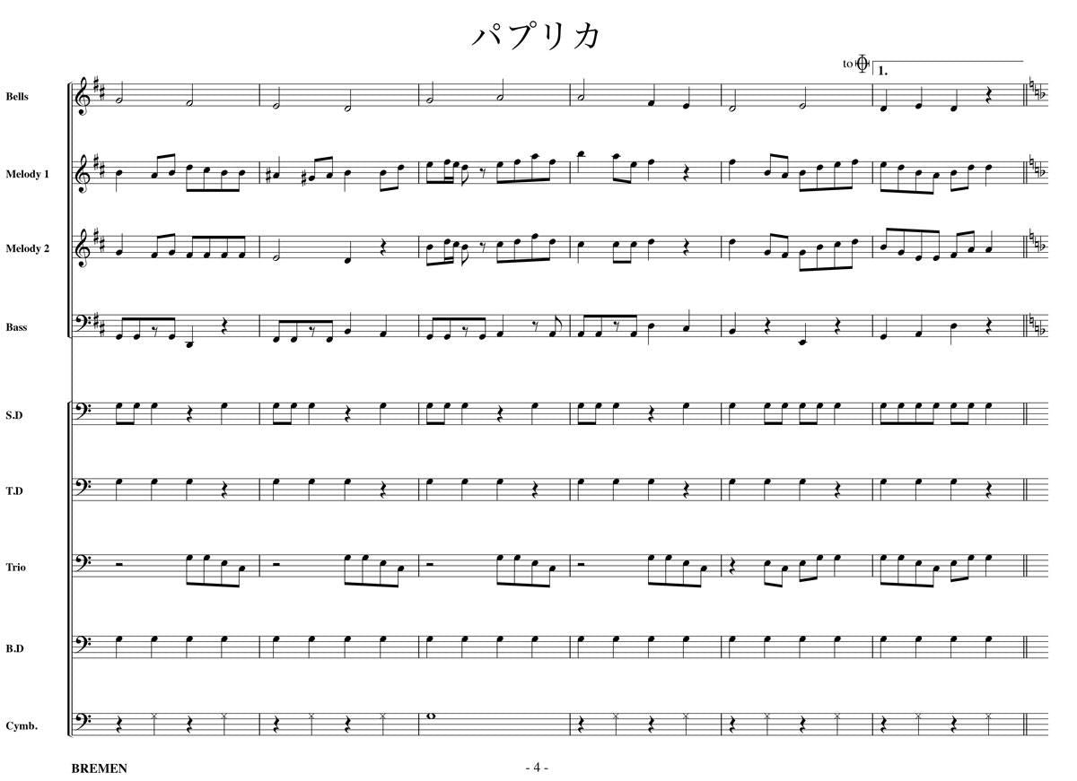 主な使用楽器:グロッケン(鉄琴)、マーチングキーボード、ベース(低音楽器)、スネアドラム(小太鼓)、テナードラム(中太鼓)、トリオタム(ツインタム)、バスドラム(大太鼓)、シンバル等