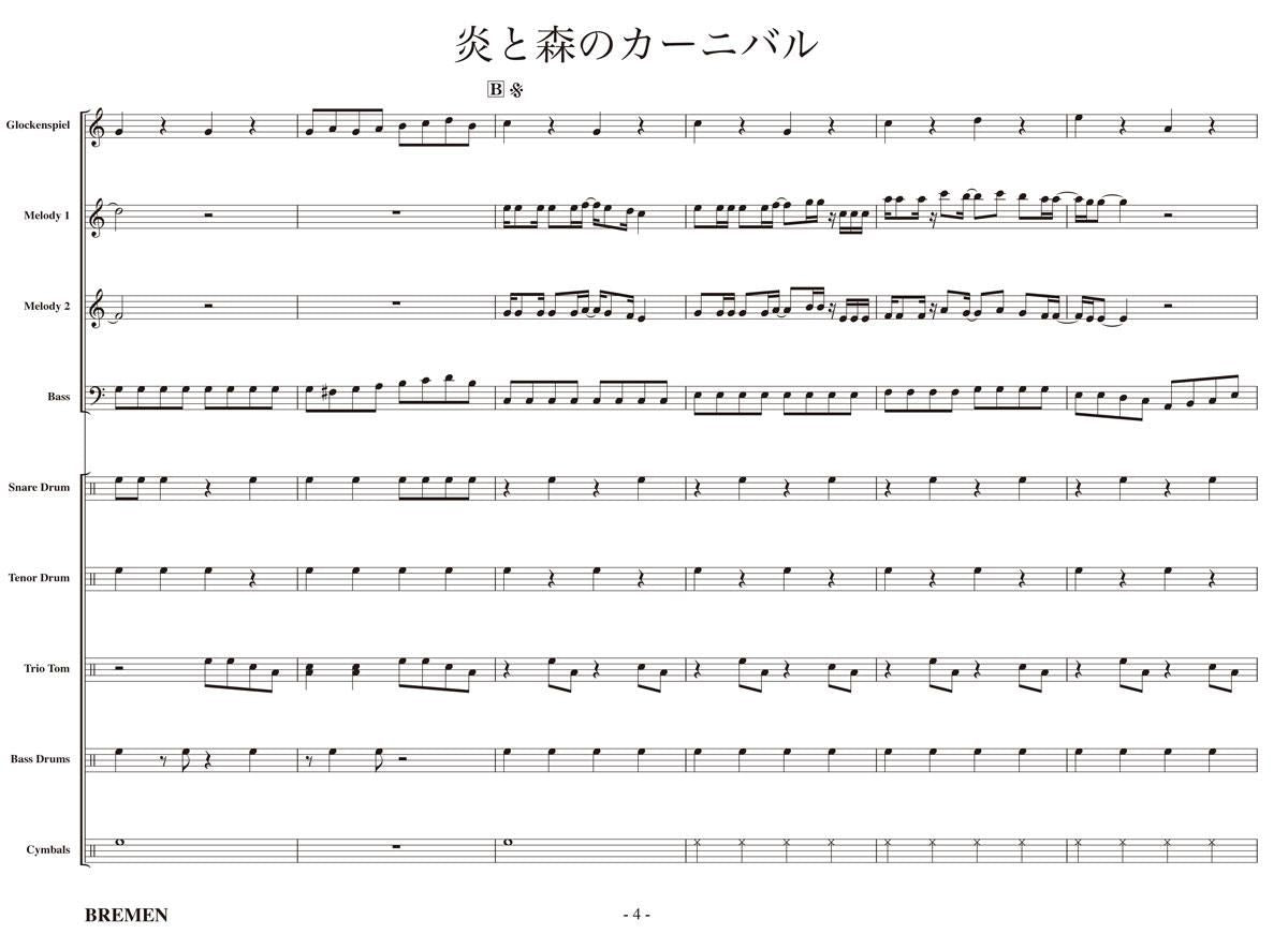 主な使用楽器:グロッケン(鉄琴)、マーチングキーボード、ベース(低音楽器)、スネアドラム(小太鼓)、テナードラム(中太鼓)、トリオタム(ツインタム)、バスドラム(大太鼓)、シンバル等