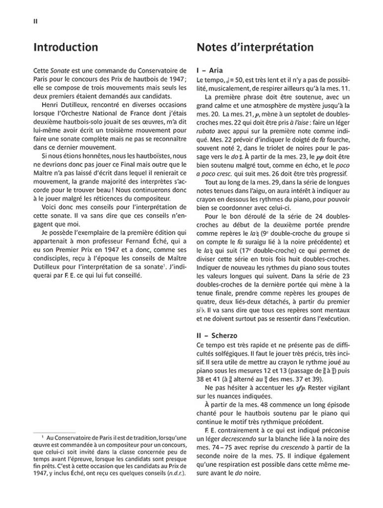 アンリ・デュティユー(1916–2013)は、20世紀フランスを代表する作曲家の一人として知られ、その洗練された色彩感と構築性により高い評価を得ている。《オーボエとピアノのためのソナタ》は1947年、パリ音楽院のオーボエコンクールのために作曲された作品である。全3楽章からなり、第1楽章は厳格なカノンに始まり、第2楽章・第3楽章ではより厚みのある音楽的テクスチュアが展開される。演奏解説を含む校訂により、コンクール課題曲としての背景とともに、実演においても有益な資料を提供する。