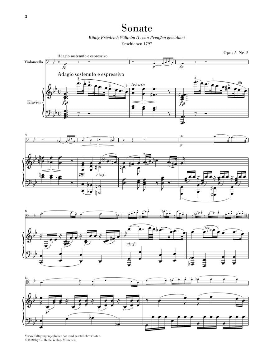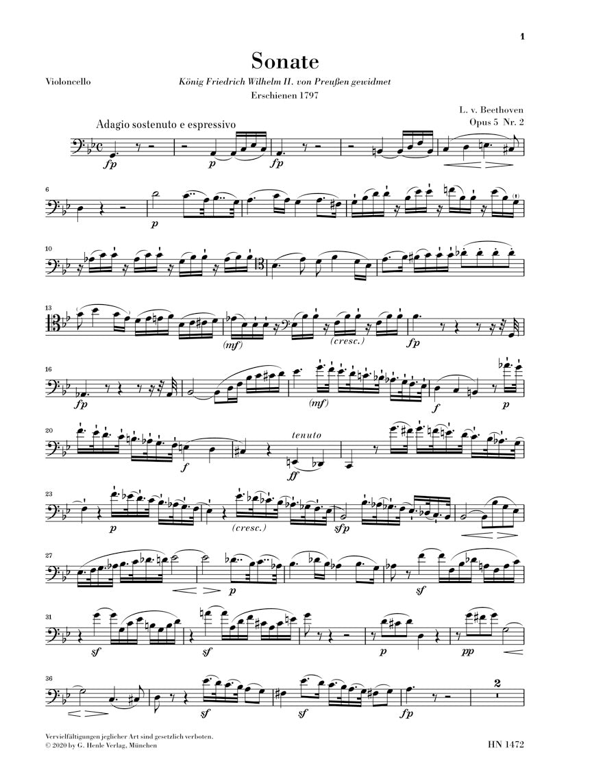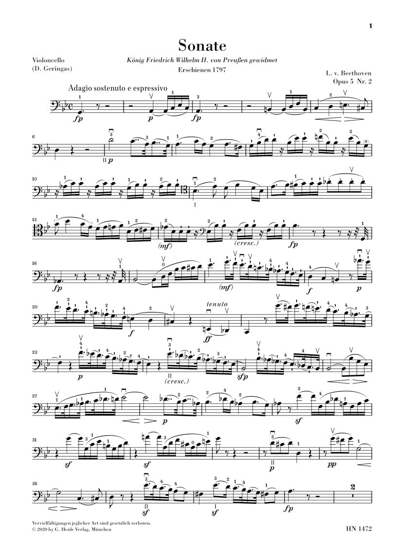 《チェロ・ソナタ ト短調》Op.5-2は、1796年にベートーヴェンがチェリストのジャン=ルイ・デュポールと共演するために作曲した、2曲からなるOp.5ソナタの一つです。技巧的なピアノパートは、ピアニストとしてのベートーヴェンが自身を強く印象付けるために設計されたものです。本作では特に冒頭の序奏が長大で、約6分に及ぶ独立楽章のような重厚さを持っています。ドゥフナーによる本原典版は、ベートーヴェン全集の校訂報告を基に編集されており、演奏者用には運指付き・なし両方のチェロパートを収録しています。