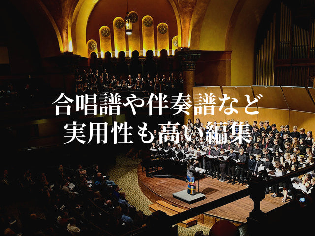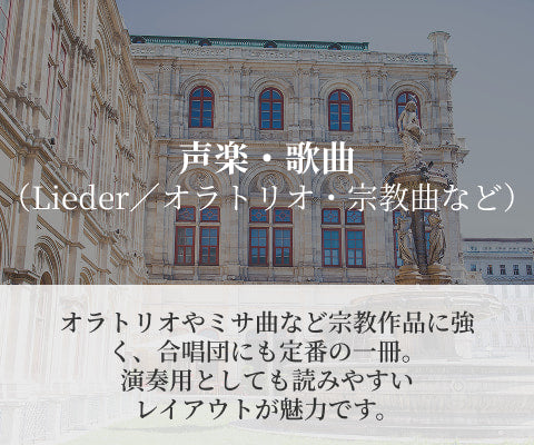 声楽・宗教曲・歌曲においては、実際の演奏現場に即したレイアウト・表記で編集されており、合唱団や教育現場でも使いやすい構成になっています。